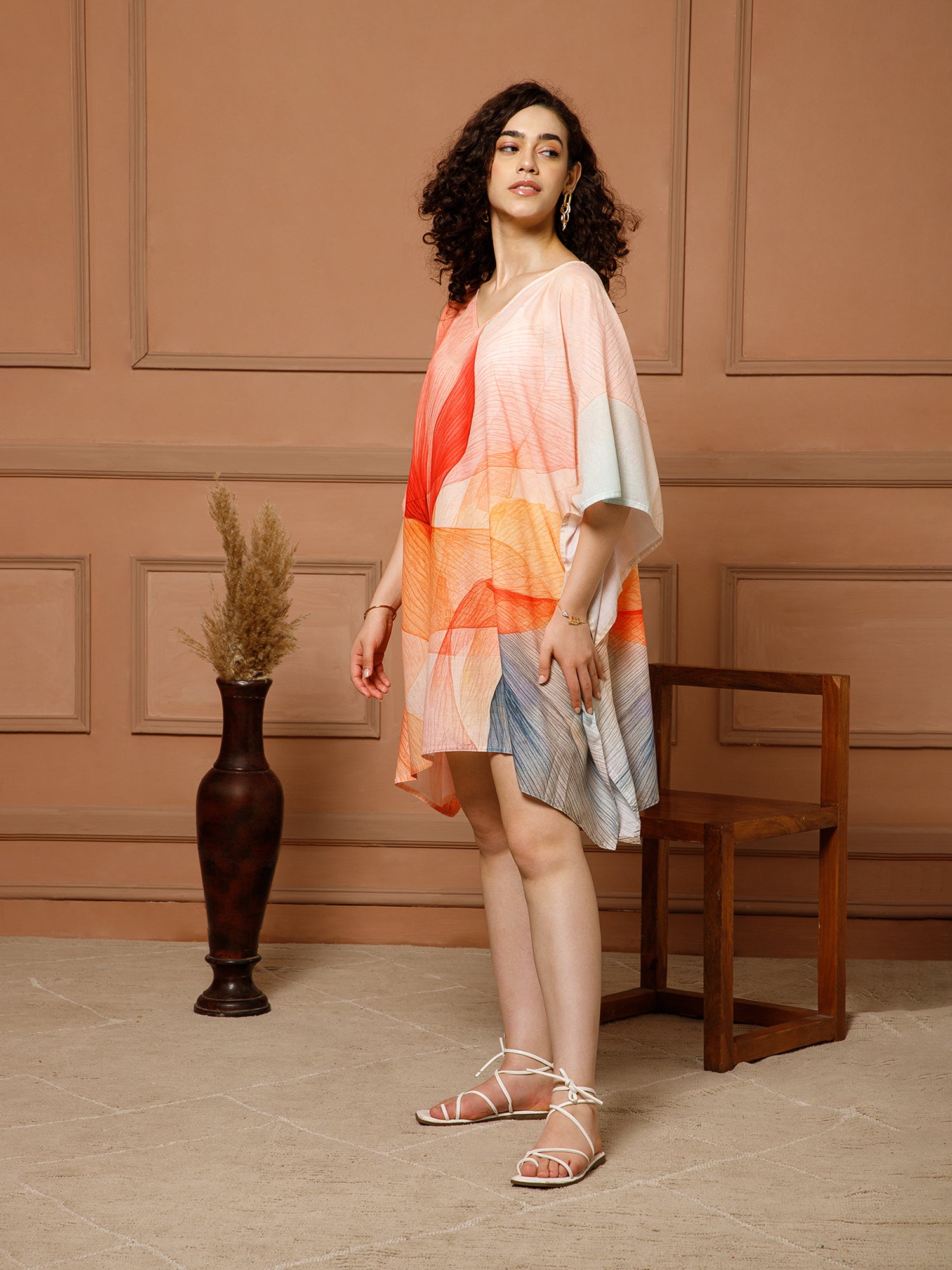Crafted from soft, breathable cotton, it features a V-neckline and vibrant abstract leaf print in peach, coral, and hints of green – perfect for casual outings, work-from-home days, or holiday wear.