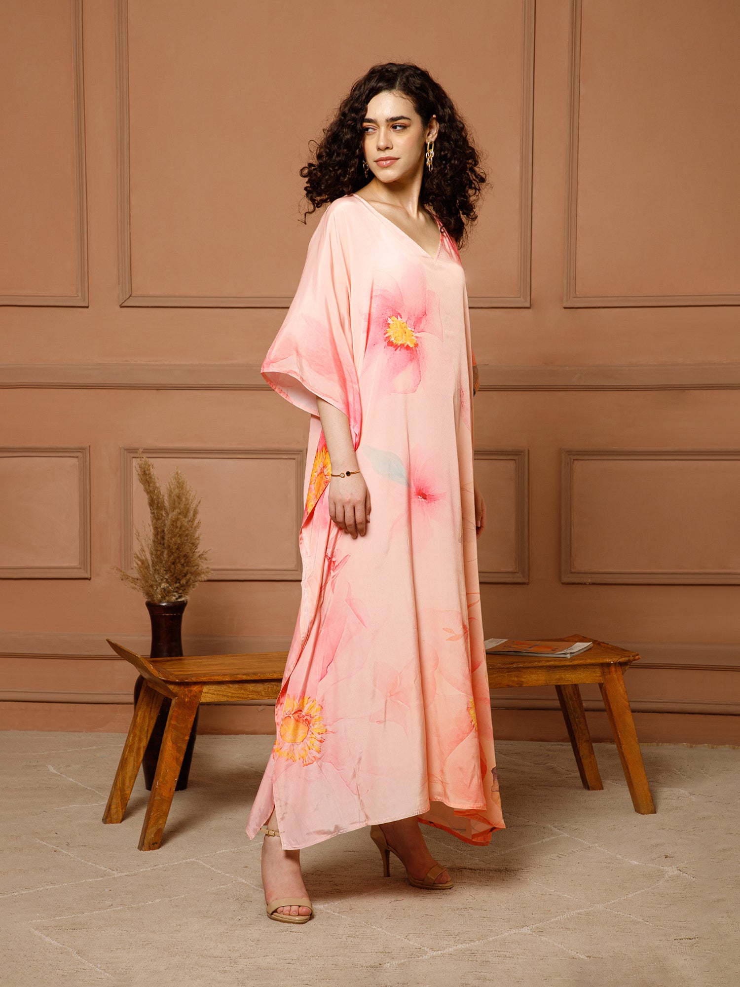 Aditi Wasan V-Neck Silk Peach Kaftan Maxi Dress