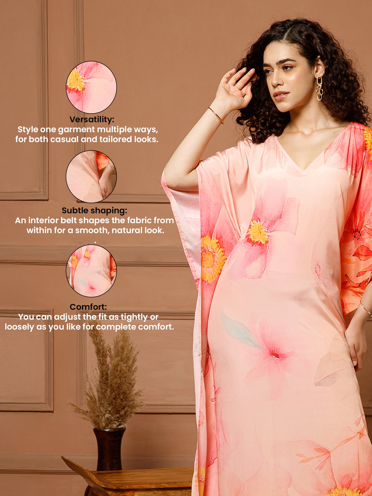 Look and feel great in the Aditi Wasan V-Neck Silk Peach Kaftan Maxi Dress. Made from soft, light silk, this peach-colored dress has pretty flower designs and a V-shaped neckline. The loose fit makes it very comfortable to wear.This dress is perfect for many occasions like relaxing at the beach, going to a pool party, enjoying a festival, or just lounging on vacation. It’s also great for moms-to-be who want a stylish and comfy outfit.