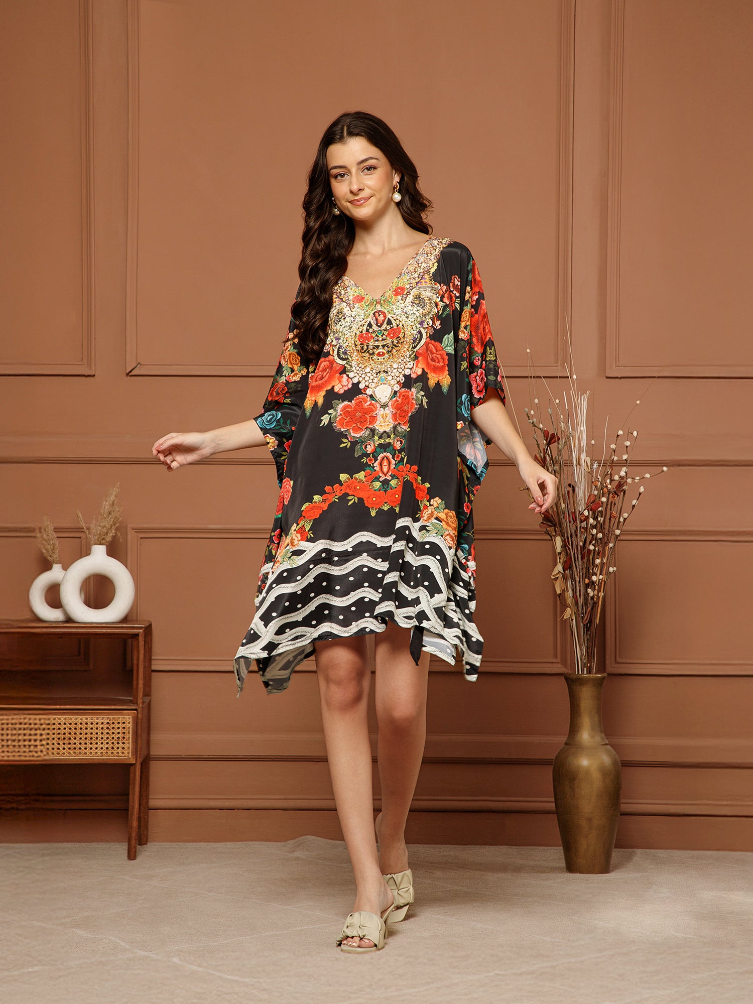 Aditi Wasan Women’s Black Poly Silk V-Neck Kaftan Midi Dress is a stylish and comfortable outfit for everyday wear. Made from soft poly silk fabric, the dress feels smooth and light on the skin. It features a flattering V-neck design that adds a simple and elegant touch. The dress comes in a black base with beautiful floral prints in red and gold tones, creating a rich and eye-catching look. The loose kaftan style gives a relaxed and flowy fit, making it very comfortable to wear throughout the day. The wide sleeves add to the easy and airy feel of the dress.