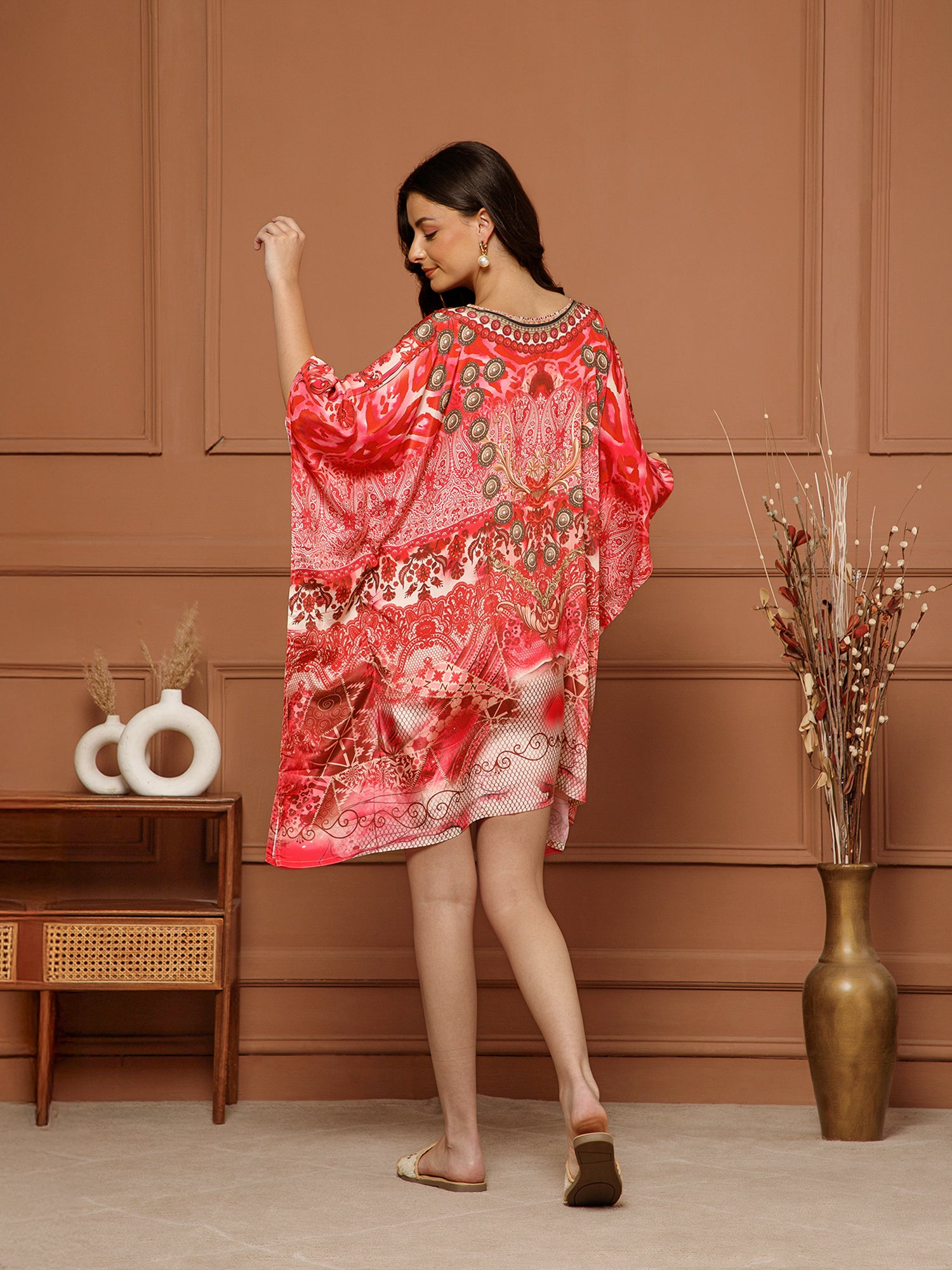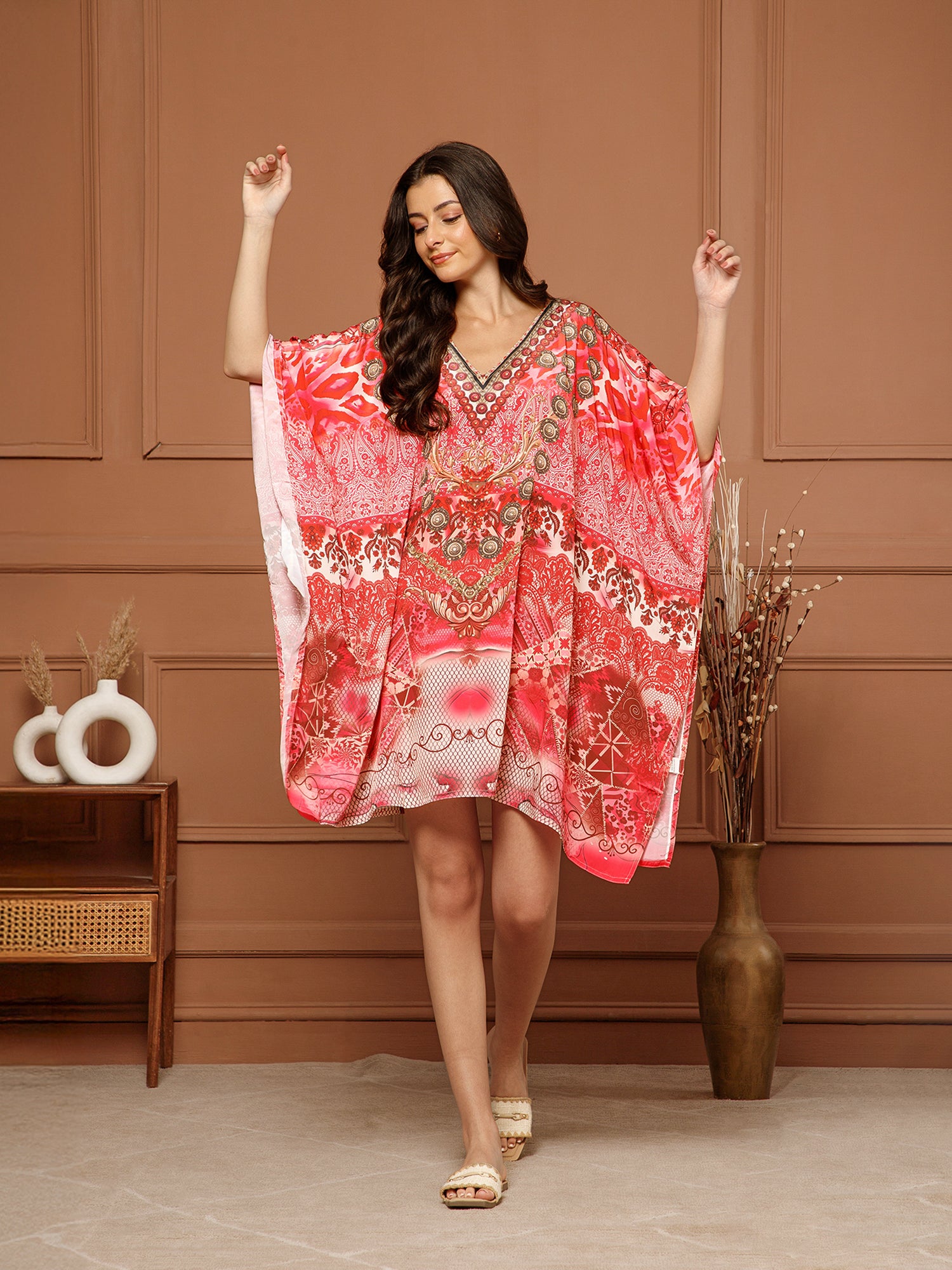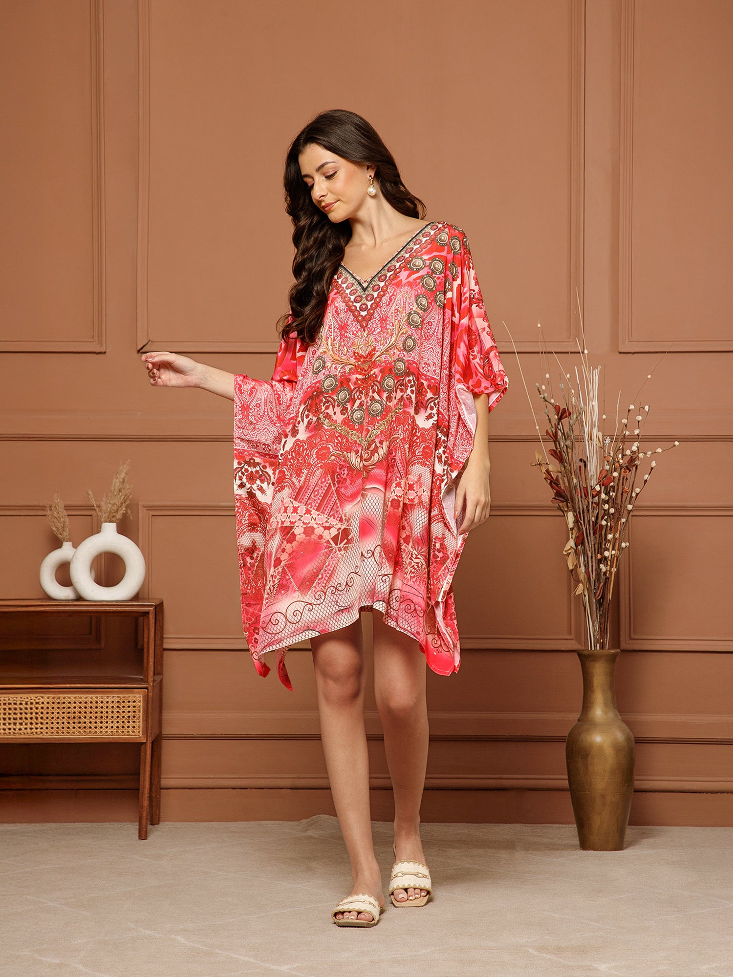Aditi Wasan Women’s Red Poly Silk V-Neck Kaftan Midi Dress is a stylish and comfortable dress for everyday wear. It is made from soft poly silk fabric that feels smooth and light on the skin. The dress features a V-neck design with beautiful detailing around the neckline that adds a nice touch. It comes in bright red with attractive floral and decorative prints, giving it a rich and elegant look. The loose kaftan style makes the dress very comfortable and easy to wear. It has a flowy fit that drapes nicely on the body and allows easy movement.This midi-length kaftan dress is perfect for casual outings, vacations, holidays, or relaxed gatherings. You can pair it with simple flats or sandals for an easy and stylish look.