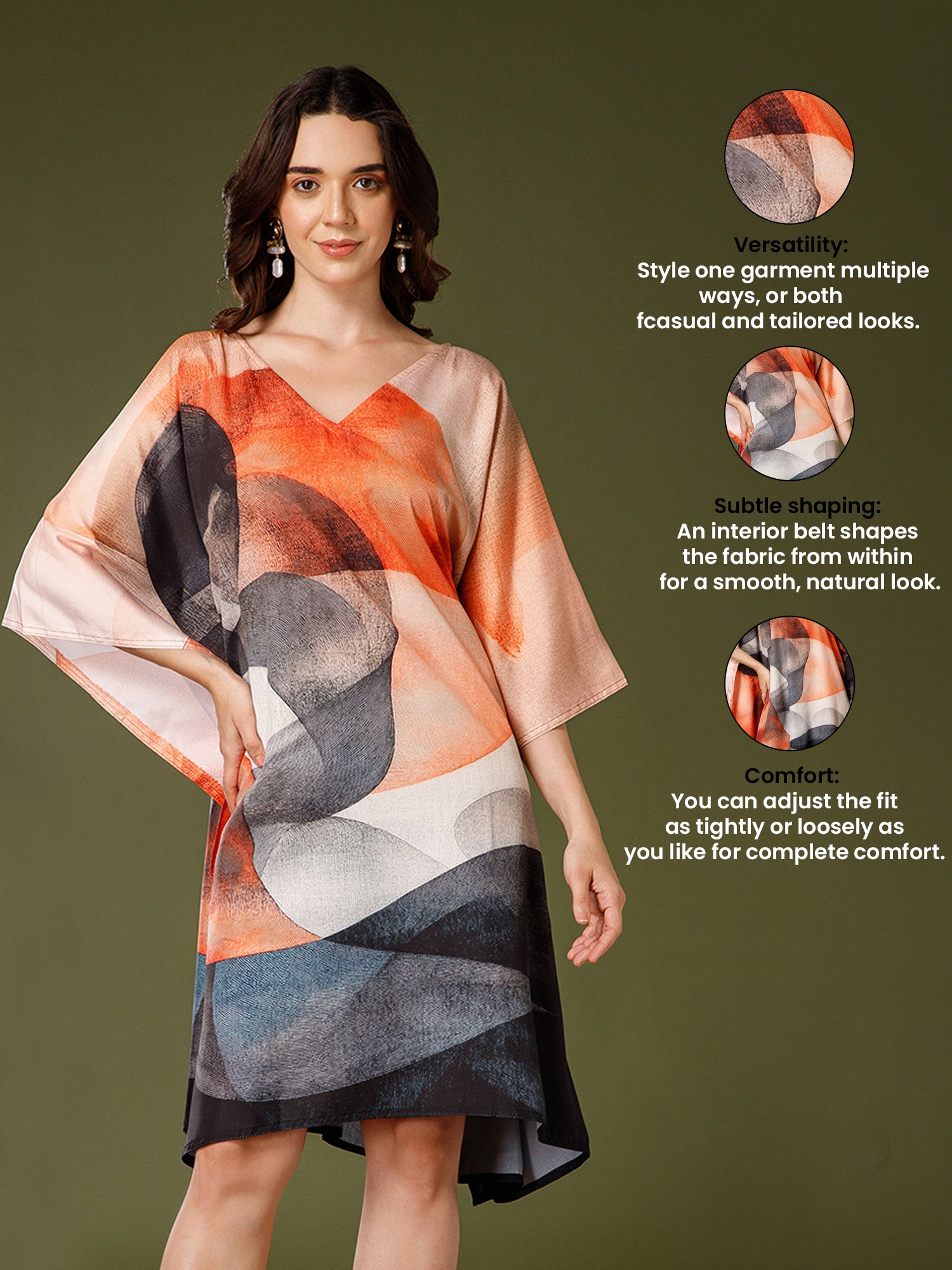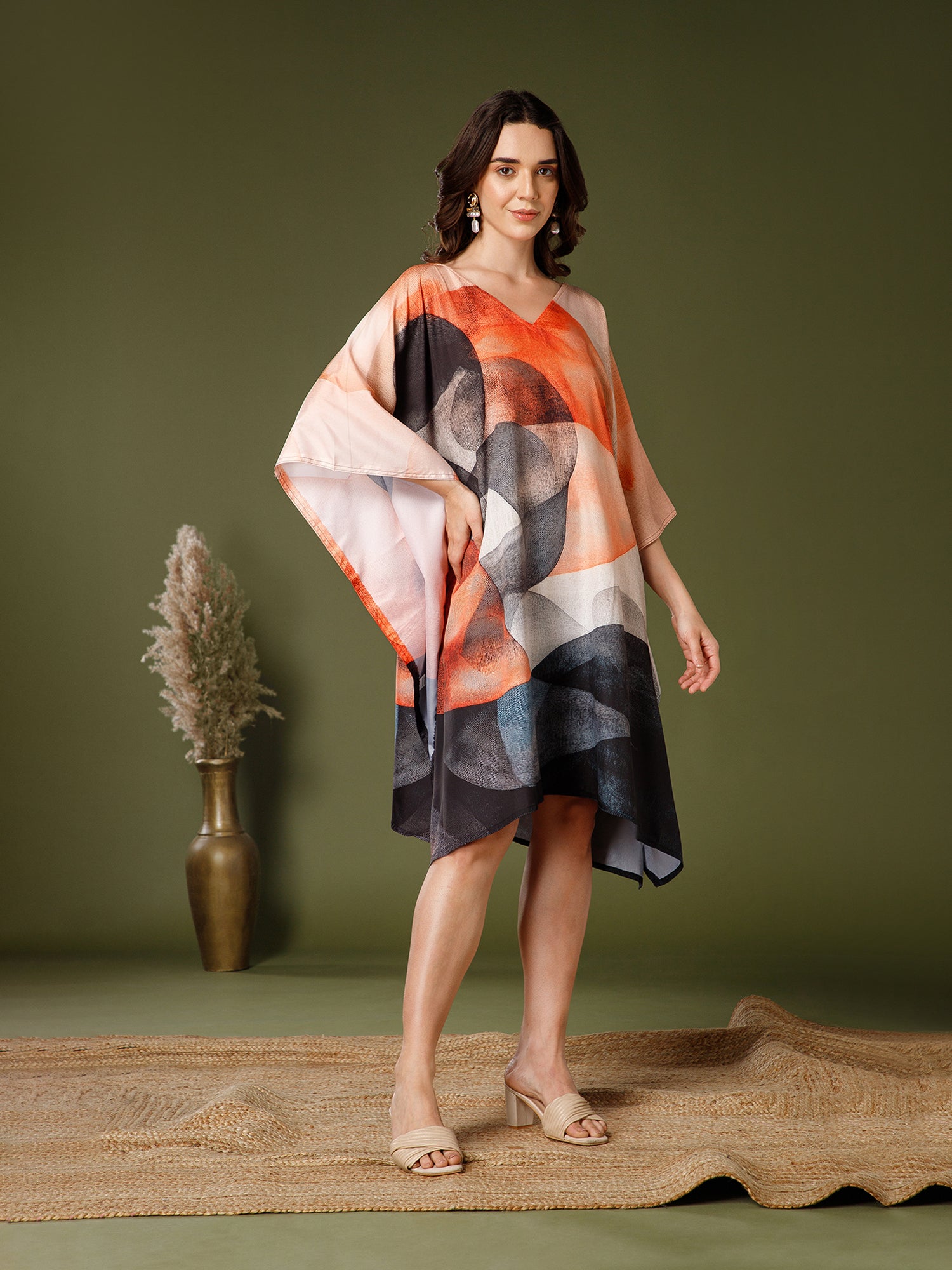 This stylish kaftan dress features a soothing beige-cream base enhanced with artistic abstract prints in shades of orange, navy, grey, and blue. Made from soft, breathable cotton, it offers a relaxed and airy feel—perfect for everyday comfort. The V-neckline adds a touch of elegance, while the loose, flowy silhouette ensures easy movement and a flattering drape on all body types.